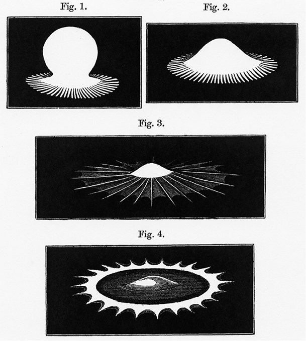 Ил. 0.1. Симметричное видение. Arthur Worthington, «A Second Paper on the Forms Assumed by Drops of Liquids Falling Vertically on a Horizontal Plate», Proceedings of the Royal Society 25 (1877), p. 500, figs. 1–4. Падая с высоты 78 мм, капли ртути Уортингтона ударяются о чистую стеклянную пластину. Сразу после первого удара (fig. 1) из точки контакта выбрасываются «лучи, слишком многочисленные, чтобы можно было оценить их количество». К моменту, запечатленному на fig. 3, «симметрично расположенные» лучи «чаще всего» сливаются в двадцать четыре спицы; на fig. 4 эти спицы, догоняемые ртутью, достигают максимального протяжения. В добавление к этому Уортингтон опубликовал множество единичных результатов («вариаций»), но ни одного, которое бы нарушало идеальную, абсолютную симметрию, которую он усматривал «за» каждым отдельным несовершенным всплеском.