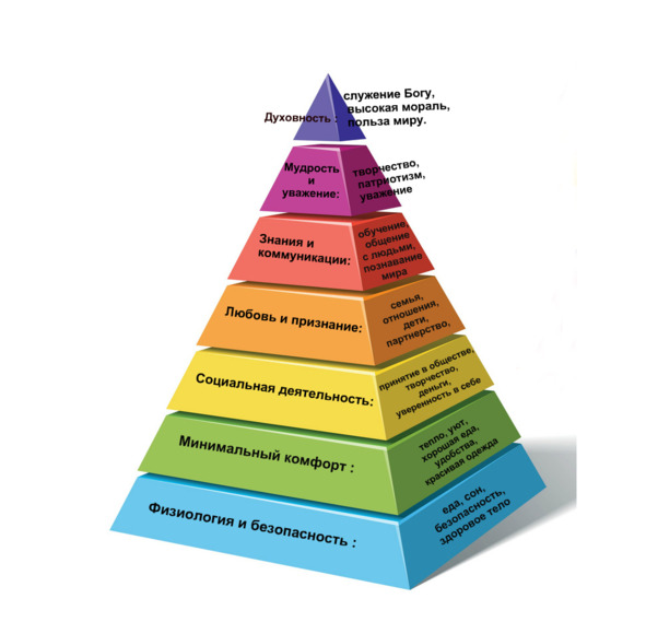 ДуховностьМудрость и уважениеЗнания и коммуникацииЛюбовь и признание Социальная деятельность Минимальный комфортФизиология и безопасность