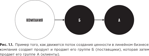Каждая из этих компаний создавала продукт или услугу, а затем продавала ее клиенту. Во многих перечисленных выше примерах ценность также росла линейно, в соответствии с направлением цепочки поставок компании. Отсюда и возник термин «линейный бизнес». В такой цепочке поставок слева от компании находились издержки, а справа – прибыль. Линейные компании создавали ценность в форме товаров и услуг, а затем продавали их вниз по цепочке поставок (см. рис. 1.1). Традиционно принято выделять два основных типа линейного бизнеса.