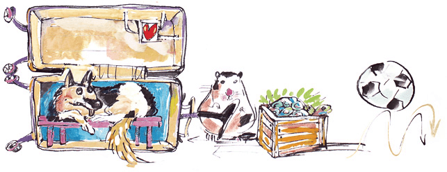 А можно поставить низенькую скамеечку. На скамеечку посадить сторожевую овчарку. Под скамеечкой тогда будет сидеть хомячок. А сбоку останется место для ящика с черепахой.
