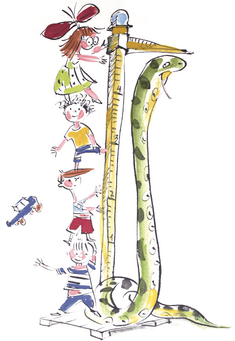 Однажды большой чемодан, который ещё не был папой, должен был изучить, можно ли поместить в него живую змею анаконду. Анаконда – это длинный удав. Самый длинный на свете. Если бы анаконда встала на кончик хвоста, а рядом с ней друг на друга поставили бы трёх мальчиков (пусть каждому будет три года), а на них – пятилетнюю девочку, то макушка девочки оказалась бы рядом с головой анаконды. Вот какой длинной была анаконда – пять с половиной метров. Её специально для этого эксперимента привезли из далёкой сельвы. Сельва – вечнозелёный лес, где очень жарко и влажно. Анаконда сидела в террариуме. Но как вынуть её оттуда и положить в чемодан?