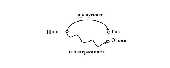 Давление (П1) перемещает газ (В1) – хорошее действие (прямая стрелка). Отсутствующий преградитель (В2) не мешает газу (В1) свободно проходить – хорошее действие (прямая стрелка). Отсутствующий преградитель (В2) не задерживает огонь (П2) – вредная связь, обозначенная волнистой стрелкой.