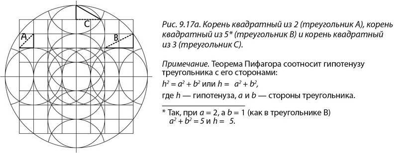 Теорема Пифагора утверждает, что диагональ (гипотенуза) прямоугольного треугольника равна корню квадратному из суммы квадратов его катетов. То есть 12 = 1; 22 = 4; затем 1+ 4 = 5, образуя диагональ корня квадратного из 5. Вот что имеется в виду под корнем квадратным из 5. Посмотрите на рисунок 9.17б, где четыре квадратика равны единице.
