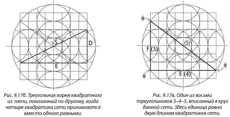 Треугольник 3–4–5 прекрасно вписывается в рисунок 9.17 в. Если длину двух квадратиков принять за единичный отрезок, то линия F равна 3 отрезкам (6 квадратикам), а линия Е – 4 отрезкам (8 квадратикам). Так как стороны треугольника равны 3 и 4, то диагональ должна быть равна 5, следовательно, образуется треугольник со сторонами 3–4–5. На самом деле их 8, идеально вписанных в эту фигуру и закручивающихся вокруг ее центра. Но самое невероятное – треугольники 3–4–5 точно вписаны в круг, касаясь тех его точек, где круг пересекает квадрат, образуя пропорцию фи. Это удивительная синхронизация, которая не может произойти в результате простого совпадения.