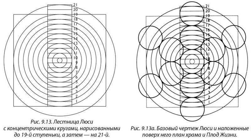 После многих-многих часов бесплодных попыток я вернулся к тому, с чего начал, и принялся заново изучать исходный рисунок Люси. Определенно, в среднем круге было пять делений и по семь делений с каждой его стороны. Потом я раздобыл специальный небольшой прибор для измерения размера ступенек лестницы. Оказалось, что семь делений под и семь делений над центральным кругом были меньше тех, что находились внутри него! Люси изменила размеры, чтобы они подходили! Она знала, что мы находимся на негармоничном уровне сознания; она знала, что лестница не впишется, если не изменить некие параметры, но хотела все это поместить в одном рисунке. Поэтому она заставила лестницу вписаться, зная, что если люди исследуют ее, то поймут, что уровень с 19 делениями, который она нарисовала, является негармоничным уровнем сознания.