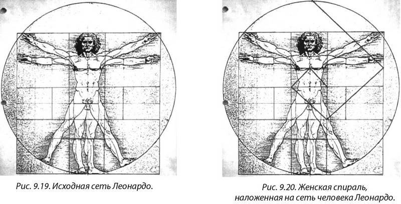 Но поскольку в своем каноне Леонардо действительно создал сеть 8 на 10 и поскольку возможно огромное разнообразие сетей, есть все основания предполагать, что он действительно понимал эти уровни сознания, основанные на геометрии. Я стал изучать все работы Леонардо, желая узнать, были ли у него рисунки канона человека с сетью 10 на 12 и 14 на 18. Я искал и искал, смотрел и смотрел, но не мог найти. Хочу подчеркнуть, что я действительно смотрел, но через некоторое время все бросил. Позже, исследуя труды Леонардо еще раз, я заметил, что рисунок канона человека, основанный на сети 8 на 10, фактически не был произведением Леонардо, так как пропорции были перерисованы с работы Витрувия. Несмотря на то что Витрувий жил примерно на 1400 лет раньше, Леонардо считал его своим главным наставником.