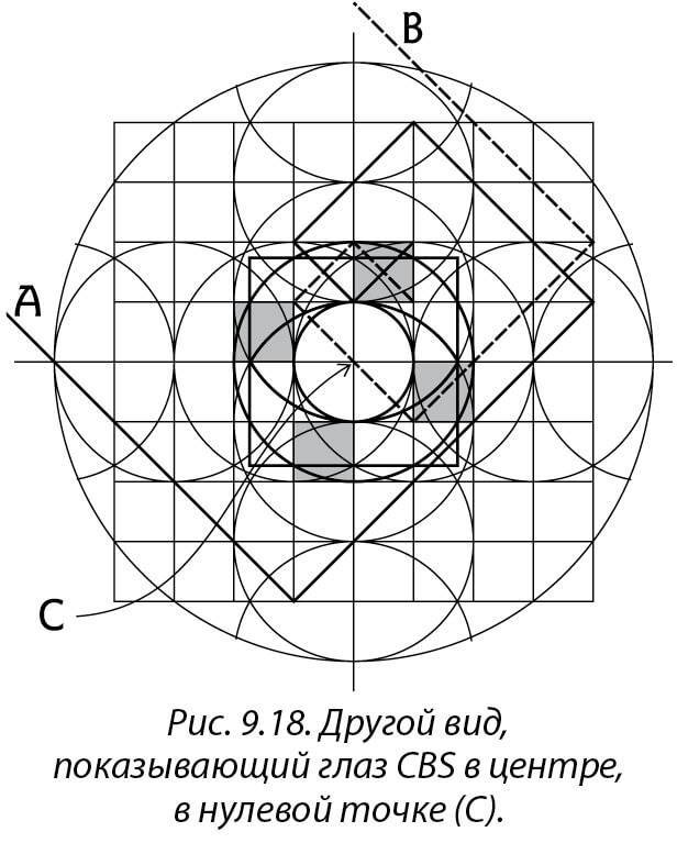 Итак, рисунок 9.26 показывает ромбовидную структуру вокруг второго уровня сознания – форму, связывающую первый и третий уровни сознания. Когда мы поворачиваем квадрат второго уровня сознания на 45° (см. рис. 9.4), он геометрически приближается к тому месту, где находится Сознание Христа, и фактически соприкасается с седьмым квадратом Сознания Христа. Та же структура квадрат – ромб в неявном виде обнаруживается в плане Великой Пирамиды. Это можно рассматривать как дополнительное доказательство того, что пирамида предназначалась для использования вторым уровнем сознания при переходе на третий уровень.