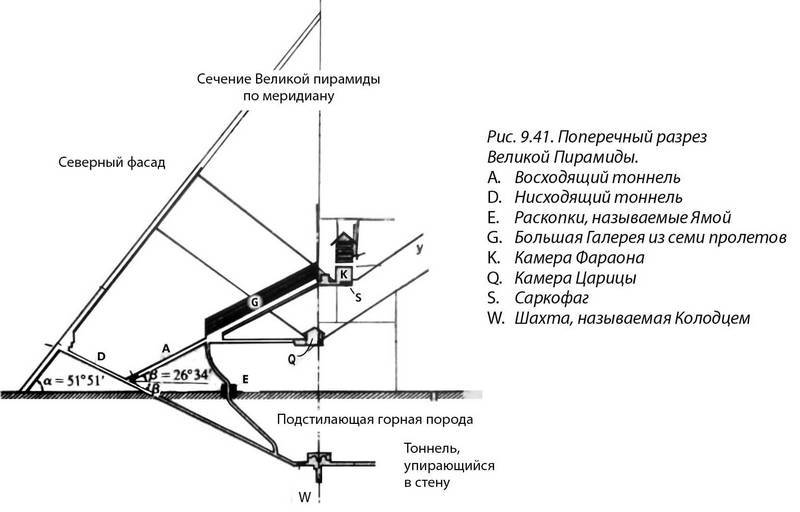 Примерно до 1990 года все думали, что Великая Пирамида (см. рис. 9.41) имеет лишь Камеру Фараона (K), Камеру Царицы (Q), Большую Галерею (G), Яму, или Пещеру (E) – какое-то очень странное место, – и Колодец (W) (названный так потому, что в этой комнате был «колодец»). Однако в последние годы найдено еще четыре комнаты (с 1994 года). Три комнаты обнаружены дополнительно за стенами Камеры Царицы. В одной комнате не было ничего, другая от пола до потолка была заполнена радиоактивным песком, а в третьей находилась массивная золотая статуя, которую, якобы, забрали японцы. (Между прочим, Камера Фараона и Камера Царицы не имеют никакого отношения к мужчинам/женщинам. Названия были даны мусульманами, которые хоронили мужчин в помещениях под плоскими, а женщин под покатыми крышами. Так что фараоны и их жены здесь ни при чем.)