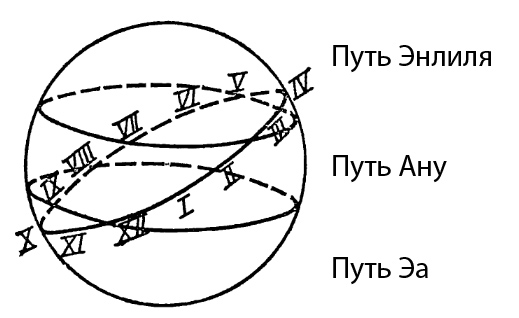 Цифры, приведенные для пути Энлиля, разбиты на пары таким образом, что северный пояс на шестидесятом градусе от Северного полюса граничит с Путём Ану, ширина которого составляет 30 градусов вверх от экватора. Путь Анну был симметричен относительно экватора, простираясь до 30 градуса южной широты, путь Энлиля представлял северный небосвод, а Путь Эа – Южный. Таким образом, путь Солнца представлял собой наклонный круг, проходящий через знаки Зодиака; этот круг подразделялся на четыре равные части зонами Эа, Анну и Энлиля так, что Солнце оставалось в каждом секторе по три месяца.