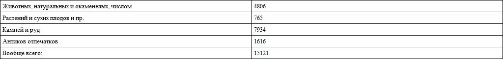 Несмотря на заявление о том, что подробное описание Кабинета Яблоновской должны будут дать его новые владельцы, то есть сотрудники Московского университета202, В. М. Севергин все-таки сделал некоторое описание коллекций в своих «Записках», по стечению обстоятельств оказавшееся единственным. Описание это состоит из двух частей: 1) общей характеристики предметов и 2) подробной характеристики собрания польских минералов, особенно привлекших внимание ученого своей полнотой, а также имевших отношение к его научным занятиям203. Общее описание Кабинета состоит из описания экспонатов по царствам природы и, далее, по месту их происхождения. О коллекции предметов животного царства В. М. Севергин пишет следующее: «Между телами животного царства отличались изящностью и редкостью своею как многие четвероногие; так и птицы, рыбы, Амфибии, насекомые, черви и животнорастения. А особливо птицы, а между Амфибиями змеи, между черепокожными же раковины, составляли собрания и многочисленные и изящные, так как и кораллы. К сему принадлежат также редкие анатомические препараты из воску сделанные, служащие для показания различных частей принадлежащих к орудиям чувств человеческих. Сие собрание в своем роде почти совершенное»204. Он отмечает: «Собрание к прозябаемому царству принадлежащее состояло из брусочков разных дерев, также камедей, смол и бальсамов, некоторых семен и других плодов, большею частию Европейских»205. О коллекции ископаемых замечает, что она содержала экспонаты из различных европейских стран, в том числе из Германии, Франции, Италии, Швейцарии, Испании, Португалии и Англии. Отмечая при этом небольшое количество минералов из России и других северных стран206, Севергин также дал описание наиболее интересных образцов минералов и назвал местности, из которых было получено наибольшее их количество: Гарц, Саксония, Кобург, Карслбад, Идрия, Гессен, Пруссия, Франция, Италия, Испания, Португалия и др., подробно описав, какие образцы из какой именно страны получены207. Таким образом, В. М. Севергин оценил коллекции княгини А. Яблоновской достаточно высоко.
