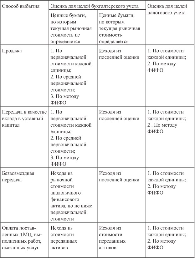 На этапе списания ценных бумаг с баланса инвестора также применяются различные методы оценки для ценных бумаг, по которым определяется и не определяется текущая рыночная стоимость. Методы оценки ценных бумаг при выбытии для целей бухгалтерского и налогового учета приведены в табл. 5.