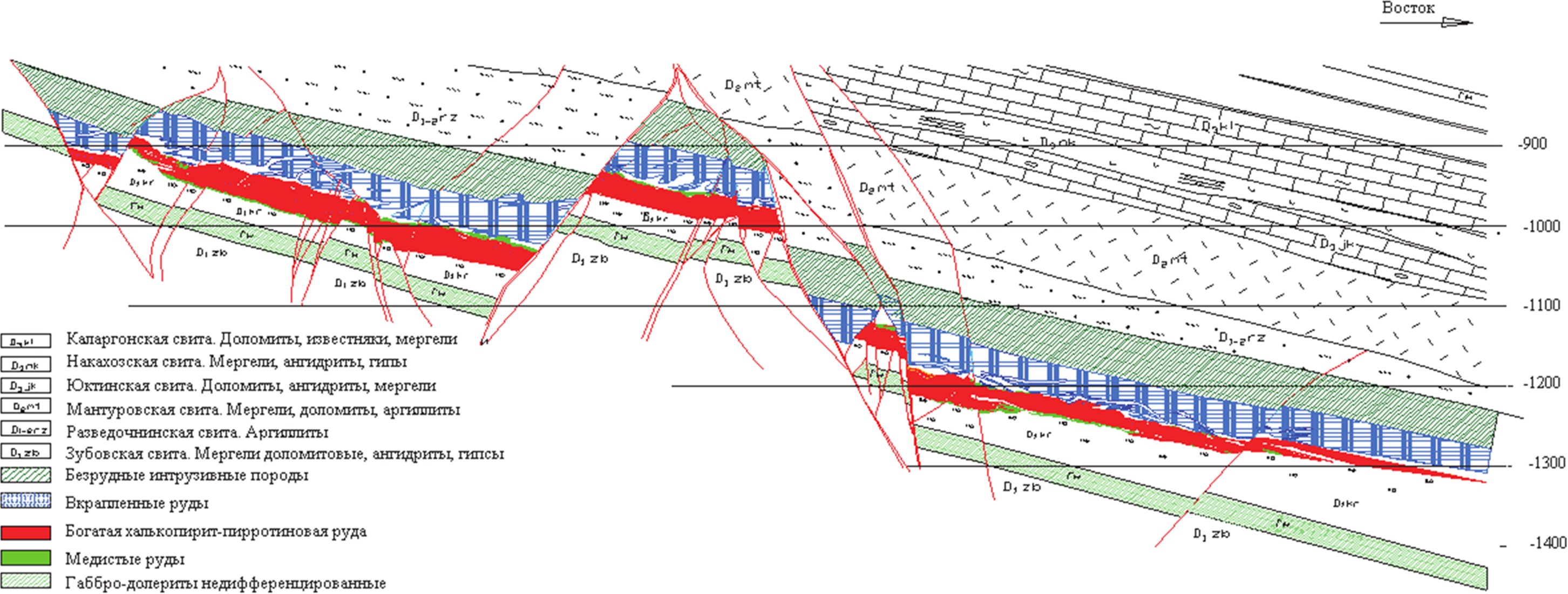 Верхняя часть пикритовых, а иногда и нижняя часть оливиновых, габбро-долеритов включают бедное вкрапленное оруденение с содержаниями сульфидов 3–5 %. В нижней части пикритовых, в такситовых и контактовых габбро-долеритах количество сульфидов достигает 12–16 %. Прожилковое оруденение встречается во всех разновидностях пород, но наиболее часто – в контактовых габбро-долеритах. Жилы и линзы сплошных сульфидных руд мощностью от 1–2 до 5–8 м распространены наиболее широко в нижней части интрузии и в породах нижнего экзоконтакта. К настоящему времени основная часть этих руд отработана.