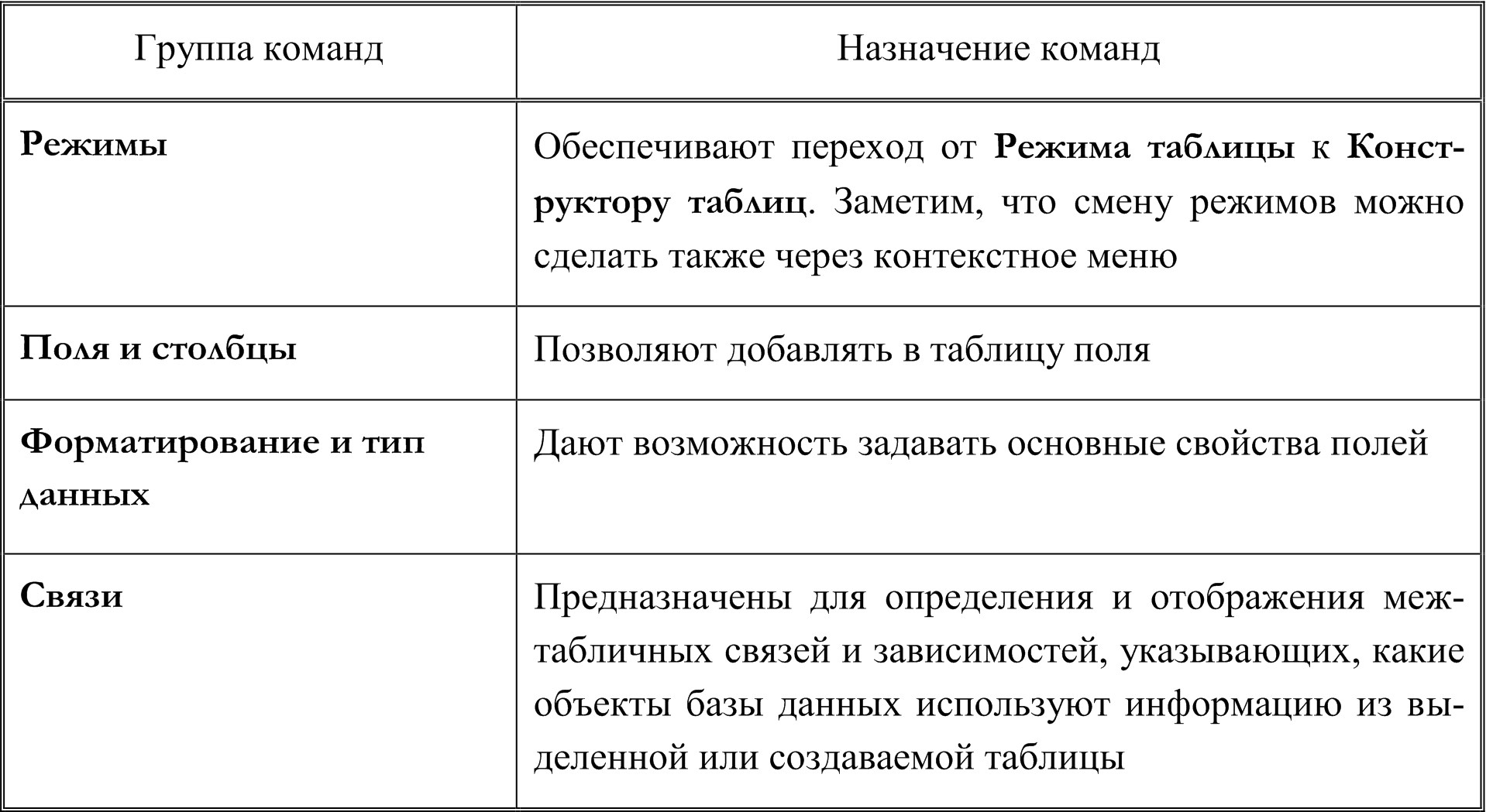 Вкладка Режим таблицы имеет четыре группы команд (табл. 1.1).