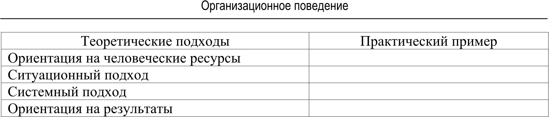 Организационное поведение основывается на следующих теоретических подходах: ориентация на человеческие ресурсы, ситуационный подход, ориентация на результаты и системный подход.