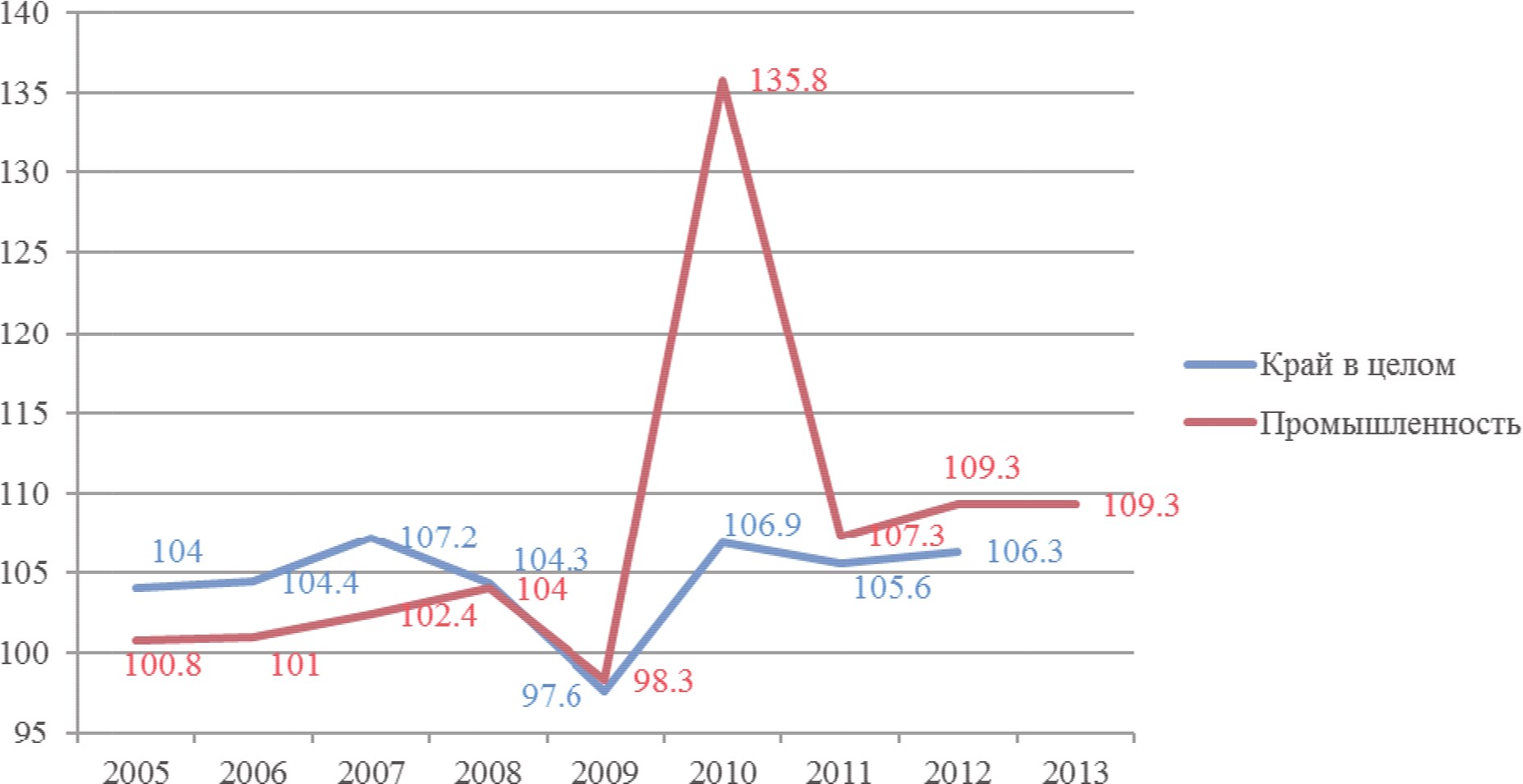 Амплитуда темпов прироста ВРП для показателей, «очищенных» от влияния инфляции, характеризует положительную динамику роста. При этом до 2009 г. темпы прироста ВРП края были ниже общероссийских, а в период посткризисного восстановления соотношение темпов меняется в пользу края.