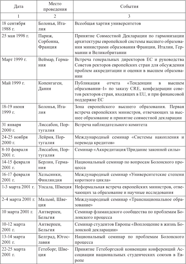 А. Келлер подчеркивает политический характер Болонского процесса. «Говоря о Болонском процессе, – пишет он, – имеют в виду не отдельные политические меры, а процесс реформирования, рассчитанный на продолжительный период и предусматривающий формирование европейского образовательного пространства и адаптацию национальных систем высшего образования к согласованным основным европейским структурам. Целью процесса реформирования является новая организация всего политического поля – политики в области образования» [82].