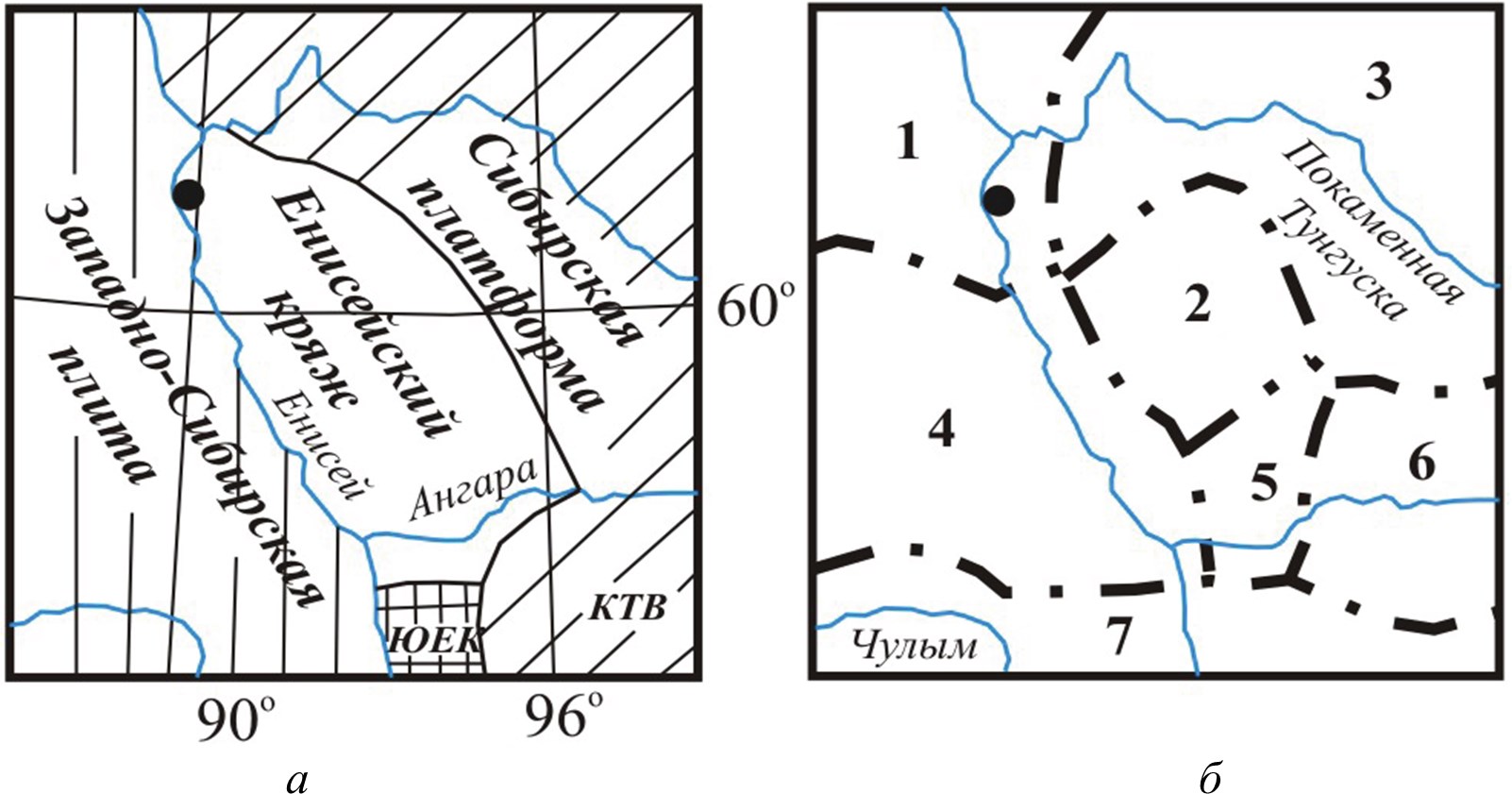 Рис. Положение Порожинского рудного узла (кружок) в региональных геологических структурах (а) и в административных подразделениях (б): цифры – районы края обозначают: 1 – Туруханский, 2 – Северо-Енисейский, 4 – Енисейский, 5 – Мотыгинский, 6 – Богучанский, 7 – группа Центральных районов и Эвенкийский национальный округ (3); аббревиатура – КТВ – Канско-Тасеевская впадина; ЮЕК – Южно-Енисейский кряж