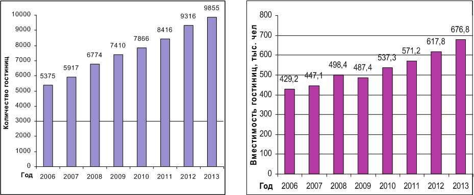 Число гостиниц и их единовременная вместимость растет (рис. 1.1), на конец 2014 г. насчитывается 9 780 гостиничных предприятий, из них 8 500 – гостиницы (см. табл. А1 прил. А), по форме собственности превалируют частные гостиницы – 8 900 (см. табл. А2 прил. А)17.