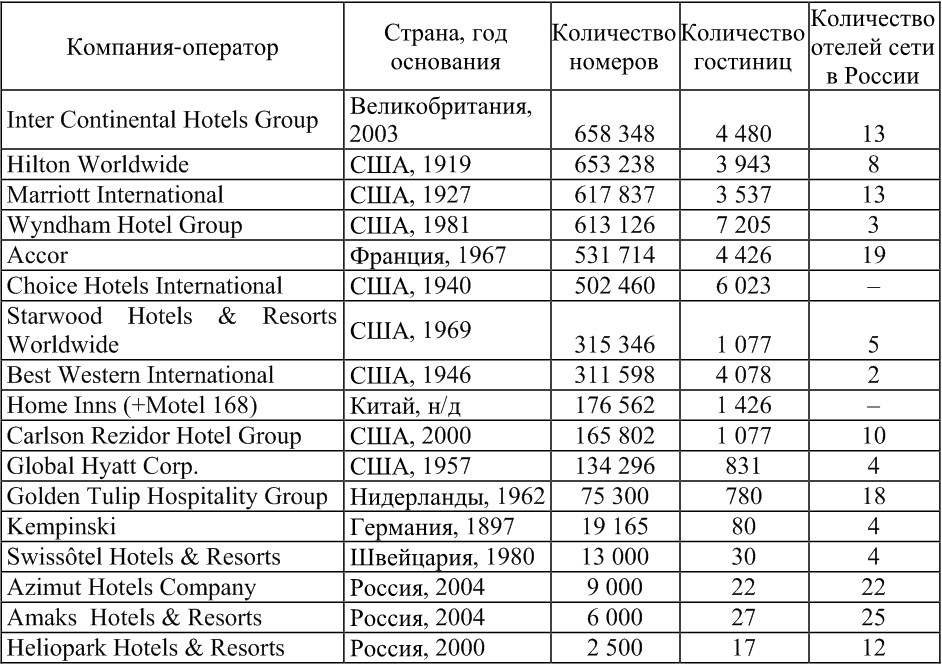 В табл. 1.1 приведены самые крупные компании-операторы гостиничных сетей (по суммарному количеству номеров в гостиницах, находящихся в управлении).