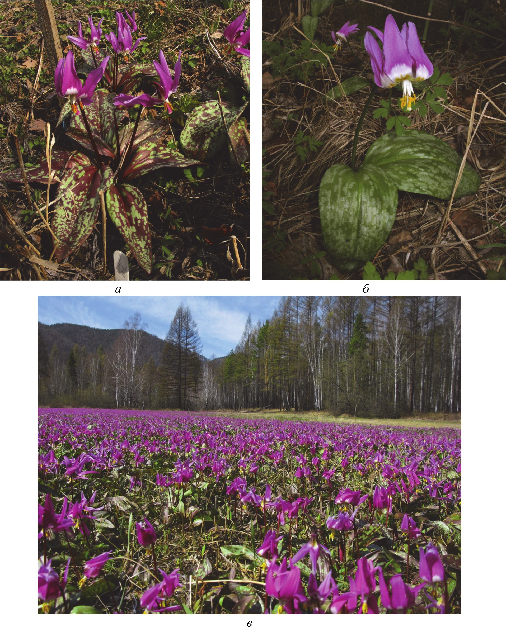 Рис. 8. Кандык саянский (Erythronium sajanense): а – цветущее растение типичной разновидности; б – растение гигантской разновидности, имеющее листья до 20 см в длину и 10 см в ширину; в – пойменный луг в долине р. Ус в период массового цветения в начале мая