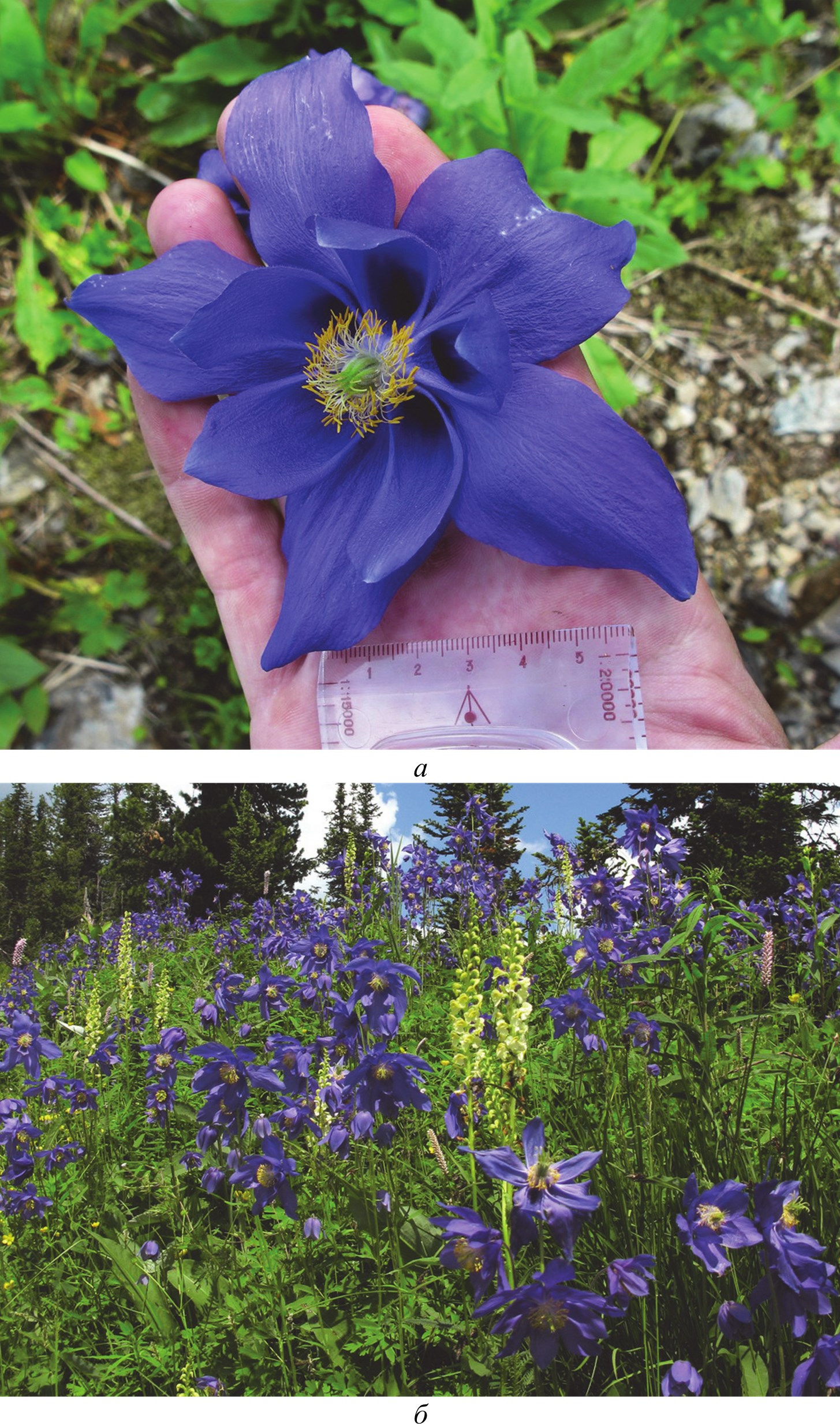 а – цветок рекордных размеров (14 см в диаметре); б – субальпийский луг на перевале в районе Полки (парк «Ергаки»)