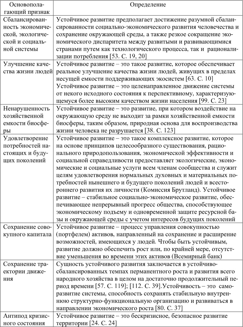 Сегодня насчитывается более 100 определений «устойчивого развития». Систематизация некоторых из них в зависимости от основополагающих признаков представлена в табл. 1.7.
