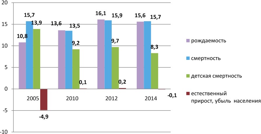 Показатели, характеризующие качество жизни населения на территории, имеют негативные тенденции. Так, показатели смертности населения остаются высокими на протяжении длительного времени, рождаемость к 2014 г. упала, естественный прирост населения – отрицательный и только в 2010 – 2012 гг. наблюдался небольшой его прирост (рис. 1.5).