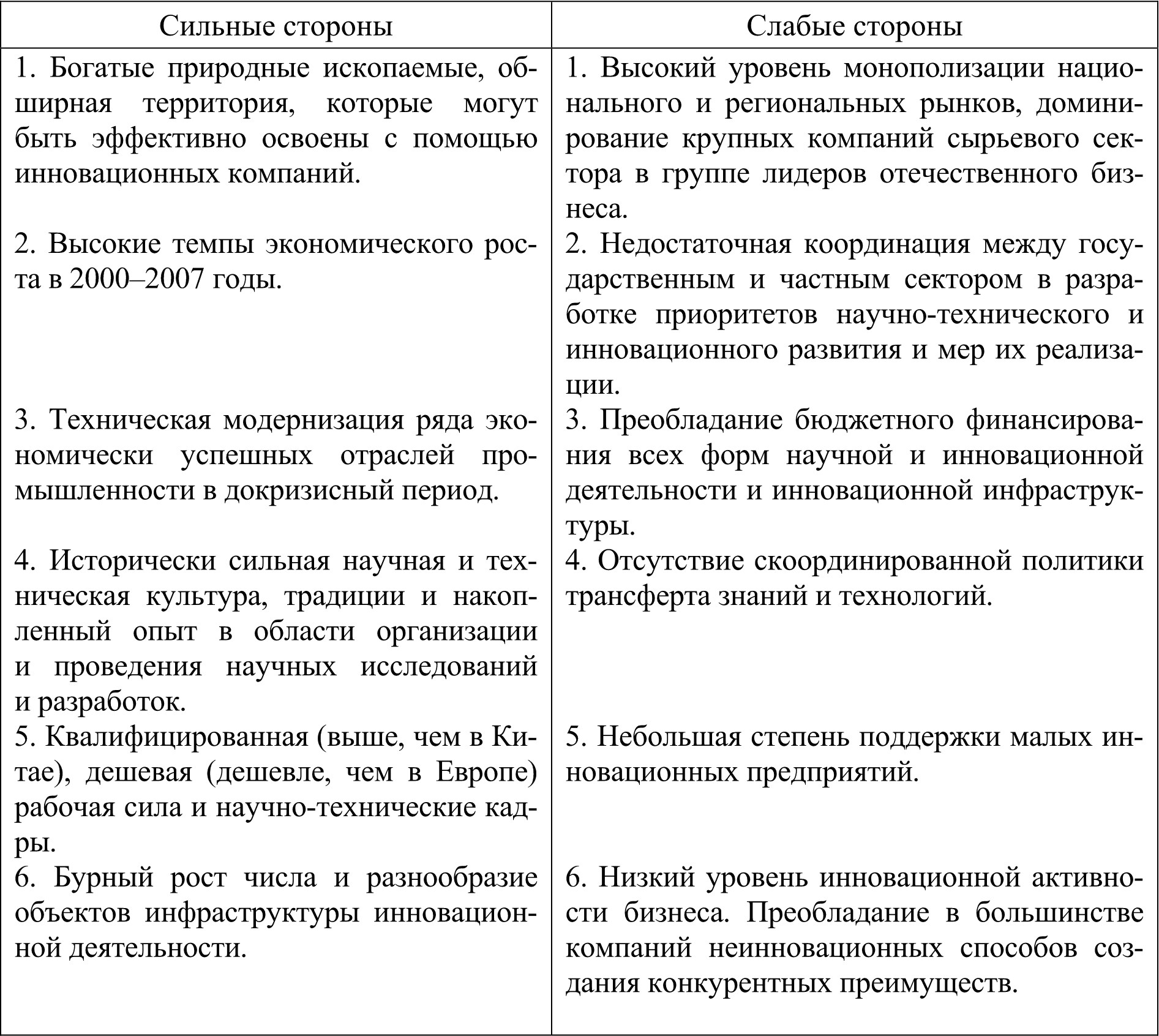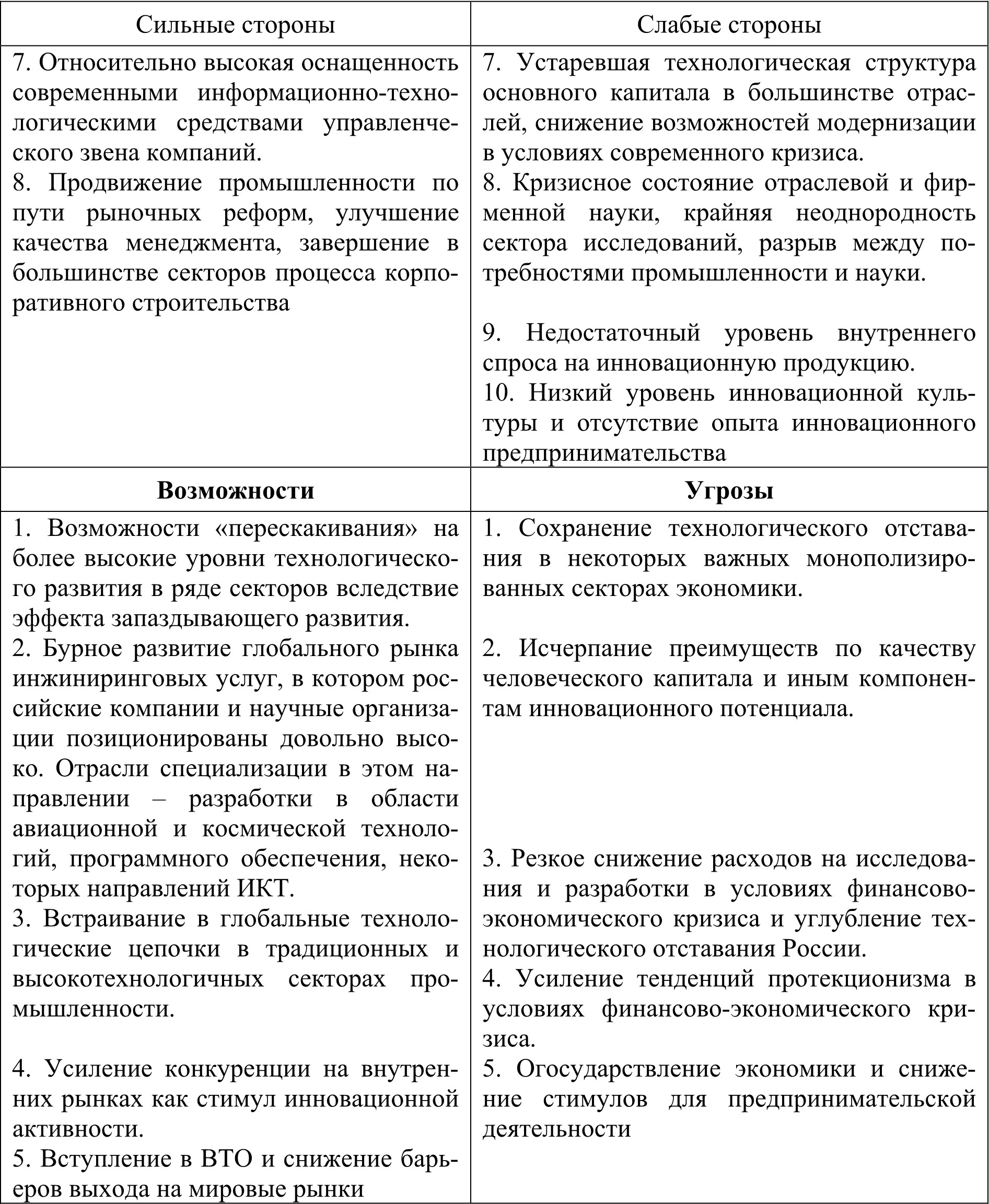 Всесторонний анализ текущего положения Российской Федерации в мировом экономическом пространстве с точки зрения инновационности развития был представлен в базовом докладе «Национальная инновационная система и государственная инновационная политика Российской Федерации» [6]. Не останавливаясь подробно на детализированном рассмотрении всех аспектов инновационного развития, приведем SWOT-анализ Российской национальной инновационной системы (табл.1).