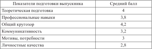 Результаты средних баллов представлены в табл. 1. По результатам выявлено, что высокие оценки работодатели поставили за уровень теоретической подготовки, за общий кругозор выпускников и низкие оценки за мотивированность, коммуникативность и личностные качества.