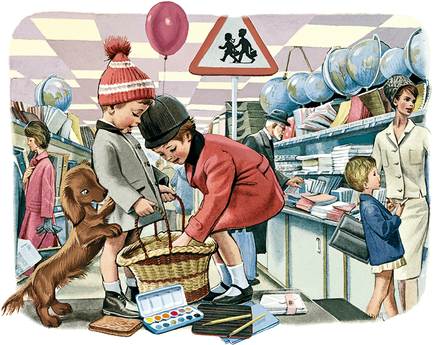 Канцелярский отдел – нам сюда! Скоро сентябрь, столько всего нужно для школы! Я даже список составила: тетрадки, ручки, краски, альбом, фломастеры, карандаши, точилка, клей и ластик.