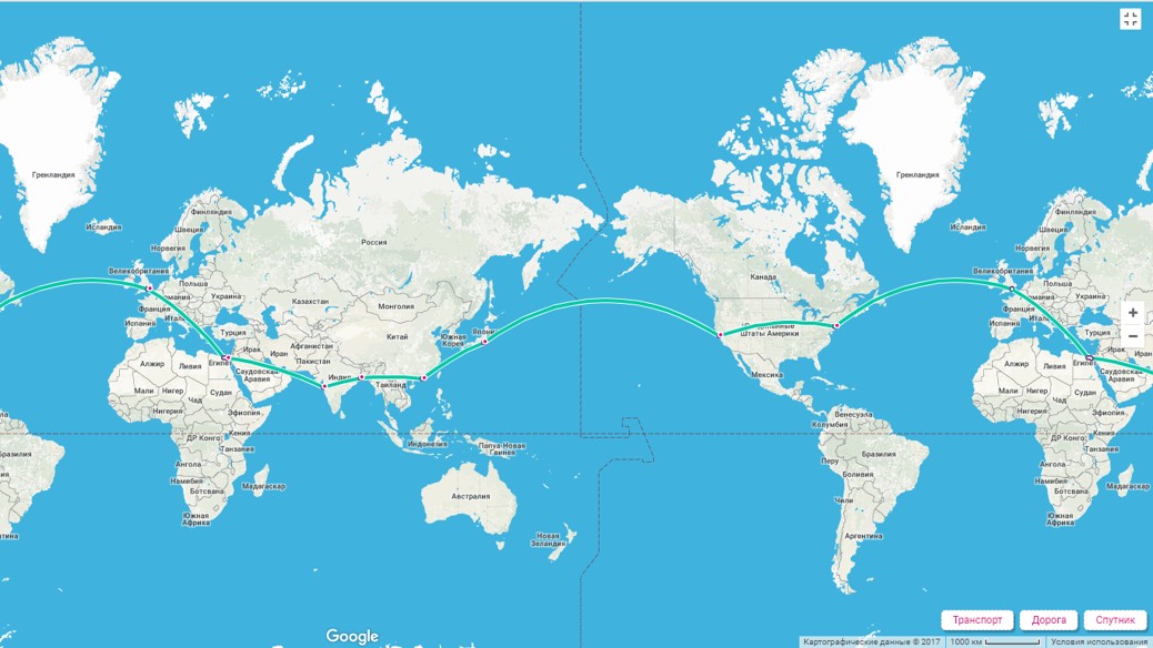 Лондон (Великобритания) – Суэц (Египет) – Мумбаи (Индия) – Калькутта (Индия) – Гонконг – Иокогама (Япония) – Сан-Франциско (США) – Нью-Йорк (США) – Лондон (Великобритания)