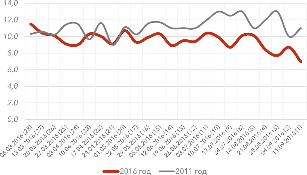 • низкая эффективность предвыборной мобилизации – такназываемого «последнего рывка». В 2011 г. оппозиционные партии (особенно ЛДПР и «Справедливая Россия») провели эффективную мобилизацию «своего» электората на фоне демобилизации электората «Единой России». В 2016 г. мобилизационный результат был выражен слабее, у КПРФ отчетливо фиксировалась демобилизация (см. рис. 6, 7, 8).
