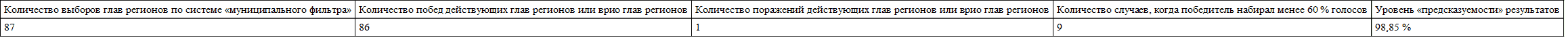– Продолжение и усиление взаимодействия на выборах глав субъектов РФ. За период 2012–2018 гг., то есть с момента введения выборов глав регионов по системе «муниципального фильтра», в подавляющем большинстве случаев победу одерживали действующие губернаторы или временно исполняющие обязанности глав регионов руководители. Среди победителей выборов глав субъектов РФ были и представители системной оппозиции, назначенные президентом РФ врио губернаторов (В. Потомский, КПРФ, Орловская область; А. Островский, ЛДПР, Смоленская область; К. Ильковский, «Справедливая Россия», Забайкальский край; Н. Белых, бывший «Союз правых сил», Кировская область). В таких случаях кандидаты от «Единой России» на выборах не выдвигались. Единственное поражение действующего врио губернатора произошло в Иркутской области, где 27 сентября 2013 г. во втором туре кандидат от «Единой России» С. Ерощенко уступил представителю КПРФ С. Левченко.