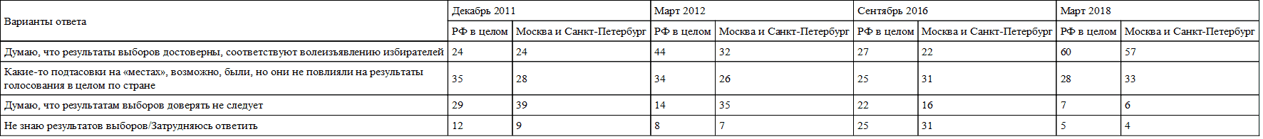 Течение большого электорального цикла продемонстрировало отсутствие массовых протестных выступлений, посвященных фальсификациям на думских и президентских выборах. Результаты исследований, проведенных ВЦИОМ в 2016–2018 гг., также свидетельствуют о том, что поставленная задача, по сути, была решена. Преобладают оценки выборов как честных, проводившихся с незначительным количеством фальсификаций.