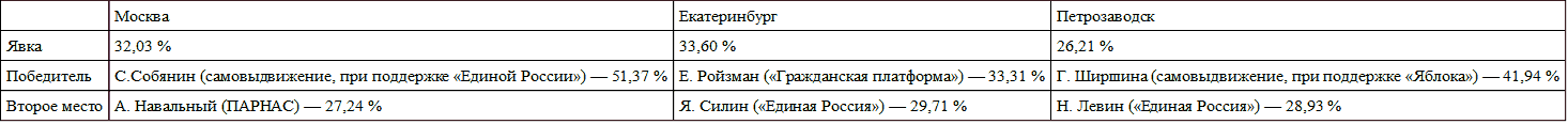 • на выборах губернатора Санкт-Петербурга не была зарегистрирована О. Дмитриева – наиболее сильный потенциальный конкурент губернатора Г. Полтавченко;[19]
