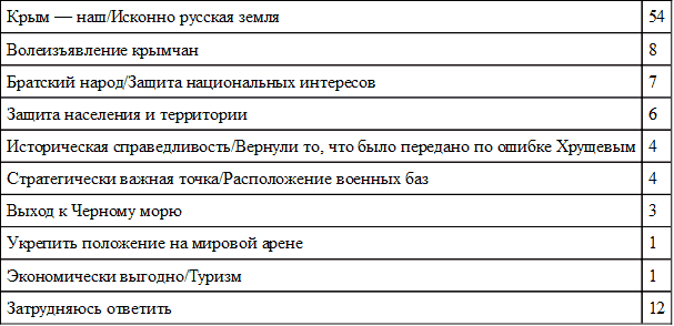 Таблица 27. Мотивы положительного отношения к присоединению Крыма (в % от опрошенных, общероссийский еженедельный квартирный опрос ВЦИОМ «Экспресс», N = 1600, открытый вопрос, любое число ответов)