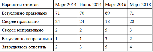 Таблица 26. Оценка правильности включения Крыма в состав России (в % от опрошенных, общероссийский еженедельный квартирный опрос ВЦИОМ «Экспресс», N = 1600)