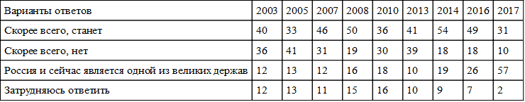 Таблица 29. Оценка вероятности того, что Россия в ближайшие 15–20 лет станет великой державой (в % от опрошенных, общероссийский еженедельный квартирный опрос ВЦИОМ «Экспресс», N = 1600)
