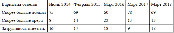 Таблица 28. Оценка последствий присоединения Крыма (в % от опрошенных, общероссийский еженедельный квартирный опрос ВЦИОМ «Экспресс», N = 1600)
