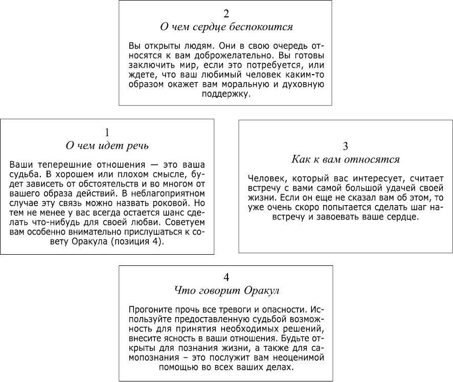 Если вы спрашиваете о любви и взаимоотношениях, тогда вам более всего подходит расклад «Оракул любви». С его помощью вы можете выяснить, как к вам относится интересующий вас человек или на что вас вдохновляет Оракул, то есть какой он вам дает совет. Типичный вопрос, который задают этому раскладу, таков: «Каковы мои взаимоотношения с этим человеком?» Давайте рассмотрим следующий пример. Из него можно сделать следующий вывод: