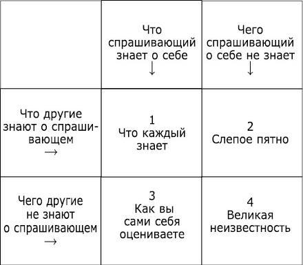 2 = Слепое пятно. То, что видят в вас другие, либо неизвестное вам вовсе, либо существующее лишь на уровне смутных догадок.