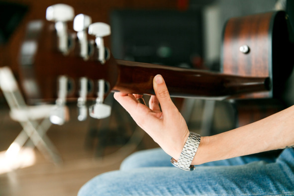 Между нижней частью грифа и вашей ладонью всегда остаётся расстояние. Мы ничего не «прижимаем». Кисть находится в положении, будто держит мячик.