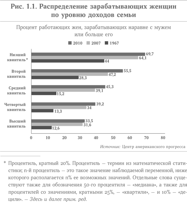 Бертран и др. (2013) установили, что опрошенные в целом неприязненно воспринимают ситуацию, когда жена зарабатывает больше мужа. Эта «неприязнь влияет также на развитие брака, возможность жены зарабатывать собственным трудом, удовлетворенность браком, вероятность развода и распределение домашнего труда». Но это не останавливает женщин от получения дипломов о высшем образовании и научных степеней в рекордных количествах. Что касается браков со «смешанным уровнем образования», то налицо выраженный рост числа женщин с высшим образованием, «выходящих замуж за неровню». Количество таких браков возросло с 12,8 % от всех браков, заключенных в 2008 г., до 14,7 % в 2015-м. Другой тип смешанного брака, в котором уровень образования мужчины выше, чем у женщины, остается исключительно стабильным: его доля составляет примерно 8,6 %. Но за этот же период доля браков, заключенных обладателями университетских дипломов, повысилась с 19,9 до 24,5 %. Можно с уверенностью предположить, что это связано с общим ростом числа американцев с высшим образованием и особенно женщин.