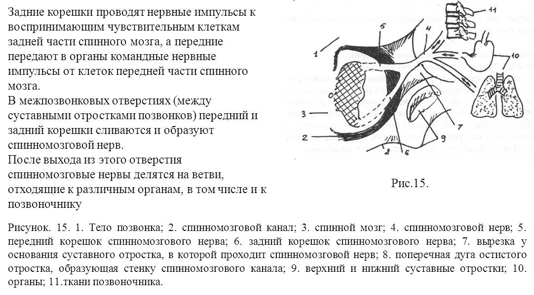 Нервные окончания от нервных клеток спинного мозга сплетаются и на коротком расстоянии от спинного мозга до входа в межпозвонковое отверстие образуют по два передних и по два задних корешка (справа и слева).