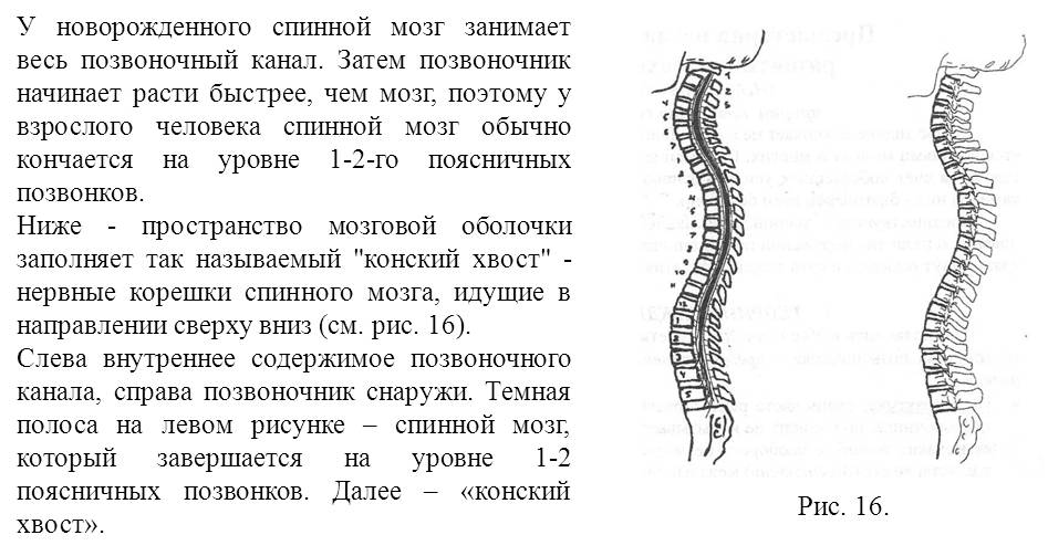 Это знание (об анатомии спинного мозга внутри позвоночника) очень важно для оценки перспектив лечения и выздоровления при сдавливании грыжами межпозвонковых хрящей сухожильного мешка («дурального мешка»), внутри которого спинной мозг размещён.