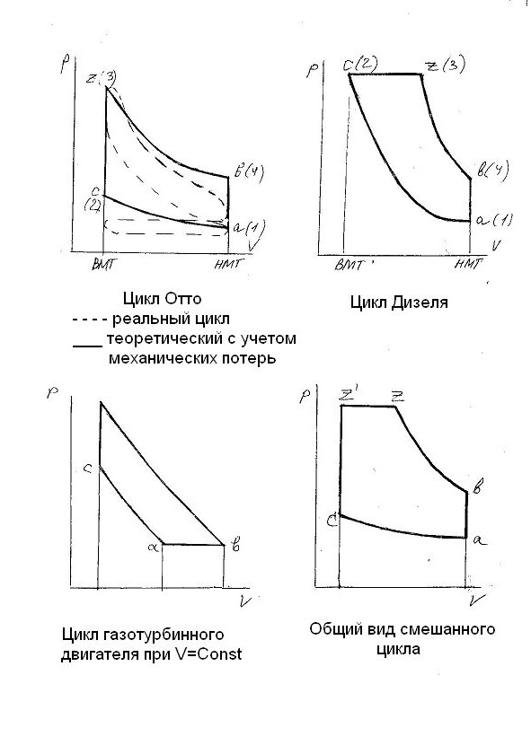 Кроме этого к характеристикам двигателя относится и индикаторная диаграмма, которая представляет собой теоретически возможные показатели двигателя без учета механических и других потерь, Поэтому Существует понятие об индикаторной мощности двигателя, которая выше Номинальной на величину неучитываемых потерь. Поэтому сам двигатель имеет коэффициент полезного действия и что принципиально важно имеет рабочий цикл, зависящий от типа двигателя, который характеризует его показатели работы. Для разных типов двигателей имеется свой рабочий теоретический цикл.