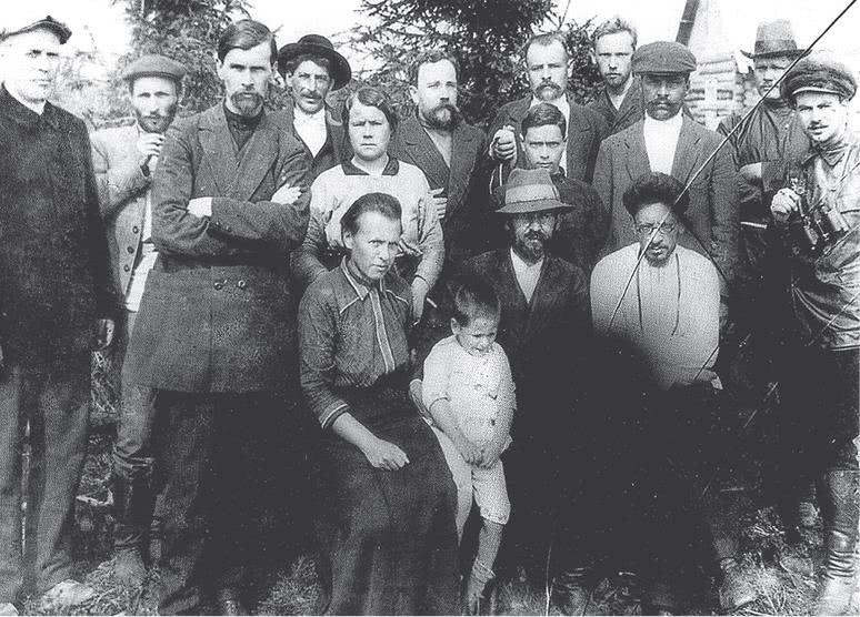 Ссыльные в Монастырском. Свердлов сидит в первом ряду в белой рубахе. Новгородцева и Андрей Свердлов в первом ряду слева. Между ними (в шляпе) – Григорий Петровский. Джугашвили (Сталин) стоит в заднем ряду в черной шляпе, в центре рядом с ним Лев Каменев. Справа в кожаном пиджаке – Филипп Голощекин