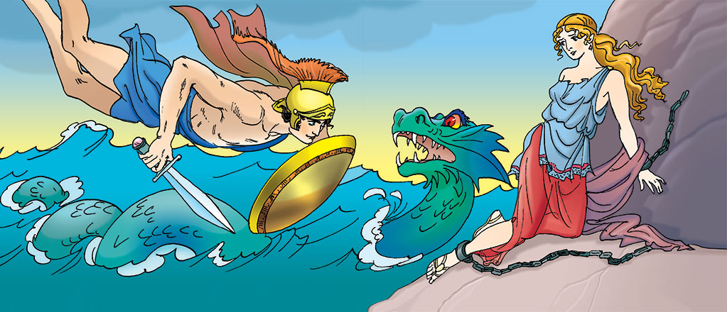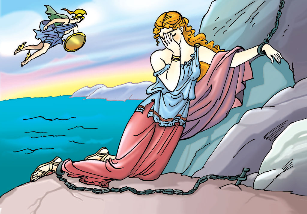 Возвращаясь домой к своей матери после победы над страшной Медузой, Персей пролетал над безводной пустыней. Из сумки за его плечами все еще падали вниз темные капли крови убитой горгоны. Долетев до раскаленного солнцем песка пустыни, они превращались в ядовитых змей, которые с шипением уползали прочь. Добравшись до границы пустыни и моря, Персей заметил в небольшой бухте одинокую человеческую фигурку. Подлетев к ней ближе, он увидел, что это красивая молодая девушка в богато вышитой одежде, прикованная за ногу длинной цепью к скале. Несмотря на жаркий день, ее тело била сильная дрожь. В одно мгновение оценив ситуацию, Персей спустился на берег, подошел к пленнице и сказал: «Не бойся! Кто ты? Что случилось с тобой, девушка?» Та кинулась на грудь юноши и, едва сдерживая рыдания, поведала ему свою историю.