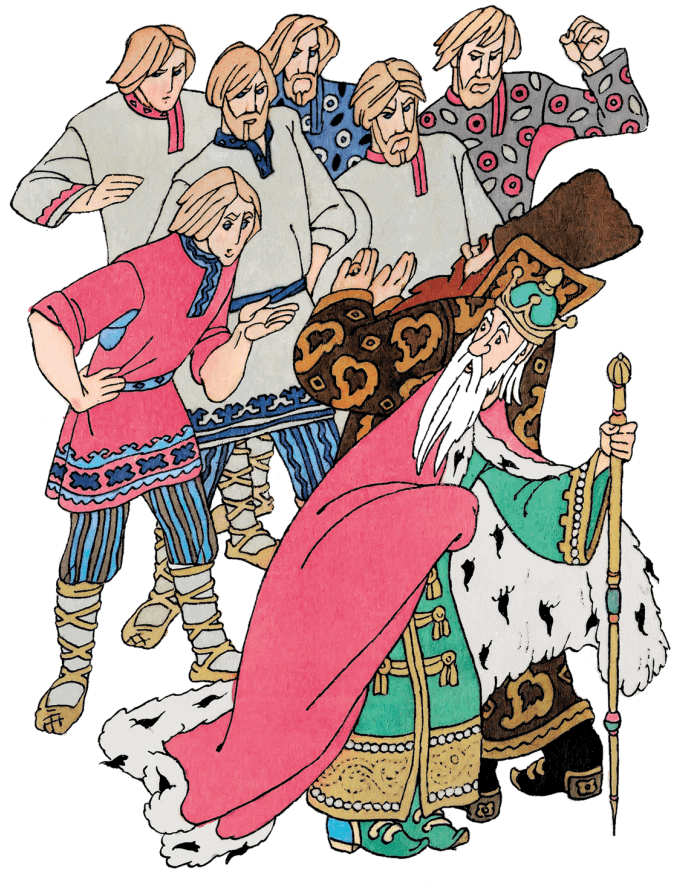Побежали они к царскому дворцу. Только схватились палачи за острые мечи, хотели Симеону голову рубить, – отколь ни возьмись, идут старшие братья: Симеон-плотник, Симеон-звездочёт, Симеон-хлебороб, Симеон-мореход, Симеон-стрелец, Симеон-кузнец.