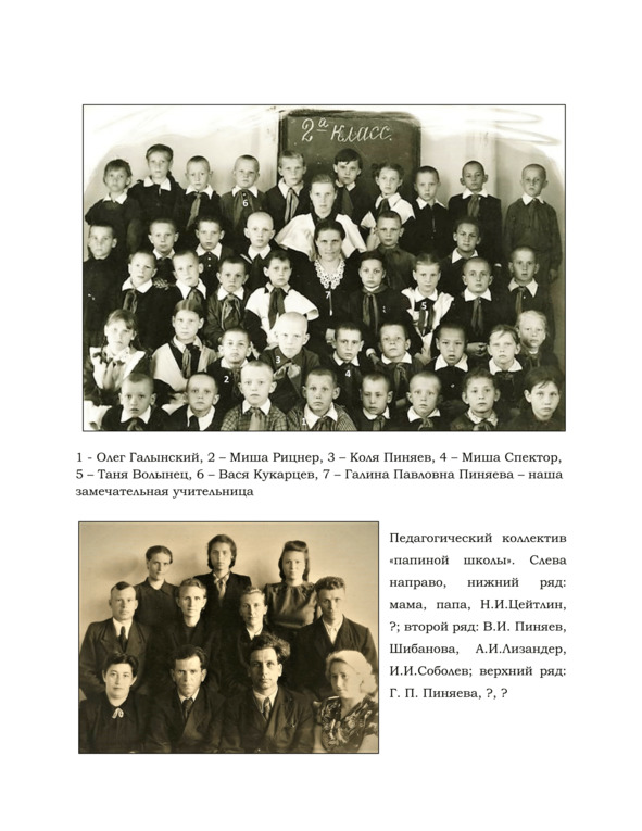 Моими одноклассниками были Коля Пиняев, Миша Спектор, Саша Кукарцев, Олег Галынский, Павленко, Радышевский, Таня Волынец, Тютюнок, Мартыненко и другие. Заводилой в классе был Олег Галынский, а лучшей ученицей – Таня Волынец. Кроме Коли Пиняева и Миши Спектора, я ничего не знаю о судьбе других.
